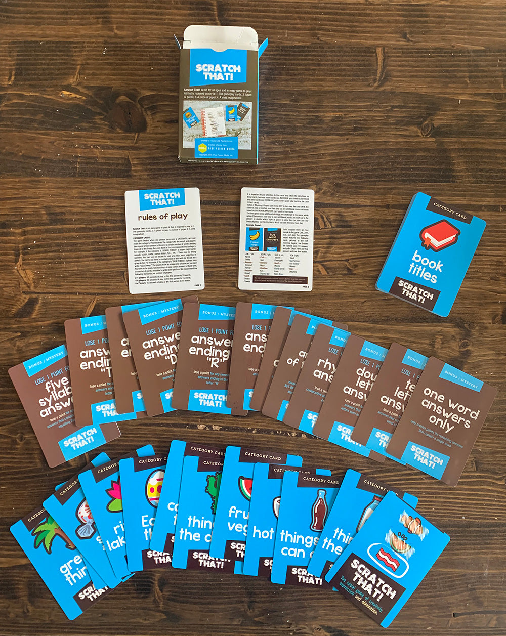 We created Scratch That! to be played for thousands of hours without ever playing the same game. These wildly creative and artisitcally visual category and challenge cards can be combined in thousands of combinations. And that's just game 1. We feature three unique games with Scratch That, that will up the excitement and fun. What will you and your friends experience when they play?