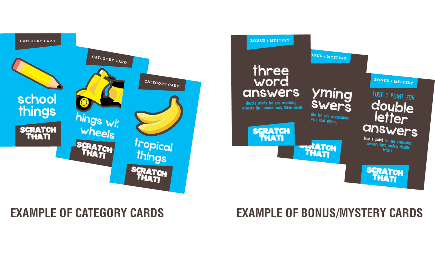 We created Scratch That! to be played for thousands of hours without ever playing the same game. These wildly creative and artisitcally visual category and challenge cards can be combined in thousands of combinations. And that's just game 1. We feature three unique games with Scratch That, that will up the excitement and fun. What will you and your friends experience when they play?